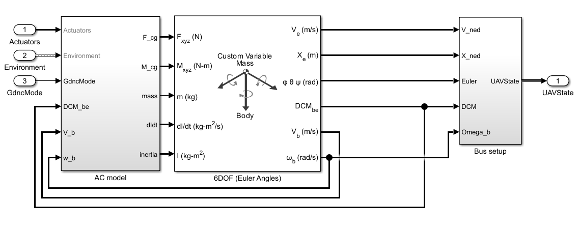 This example builds upon on the model described in the UAV Package Delivery (UAV Toolbox) example, providing a variable mass model for simulating package dropoff dynamics. It also provides additional details on the plant model used to simulate the 6DOF vehicle dynamics.