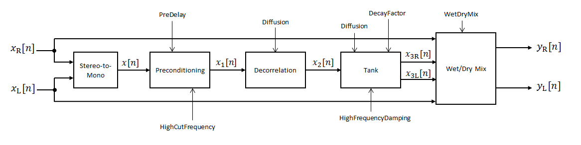 The algorithm to add reverberation follows the plate-class reverberation topology described in [1] and is based on a 29,761 Hz sample rate.