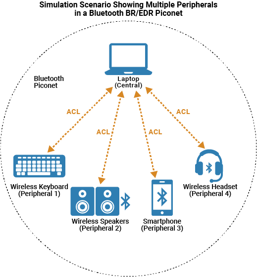 Figure showing a Bluetooth BR/EDR piconet consisting of one Central node connected to four Peripheral nodes on ACL connections.