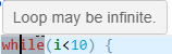 In the loop body, the run-time error typically occurs as an orange check of another type on an operation. The check is orange and not red because the operation typically passes the check in the first few loop iterations and fails only in a later iteration. However, because the failure occurs every time the loop runs, the Non-terminating loop check on the loop keyword is red.