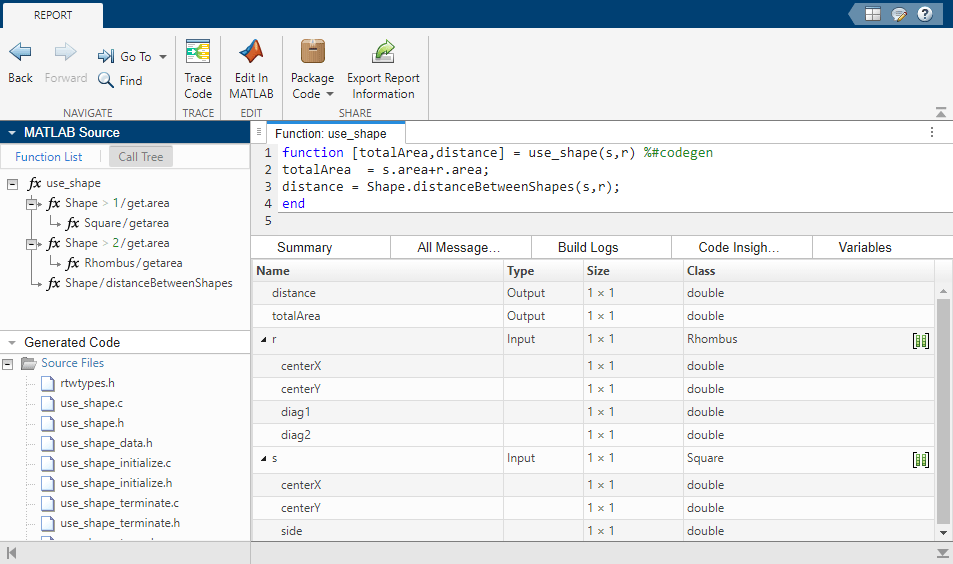 Examine the code generation report for use_shape. In the right pane, the Variables tab shows that r and s are instances of classes Rhombus and Square, respectively. In the left pane, the Call Tree tab shows that use_shape calls the getArea method of each subclass, as well as the distanceBetweenShapes method of the superclass.