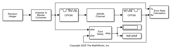 The cm_cpfsk_mod_demod model generates random integer data, converts it to bipolar values, and then applies CPFSK modulation to frames data. The CPFSK-modulated signal passes through an AWGN channel and then is demodulated by using the CPFSK method. The bit error rate is calculated on frames of data.
