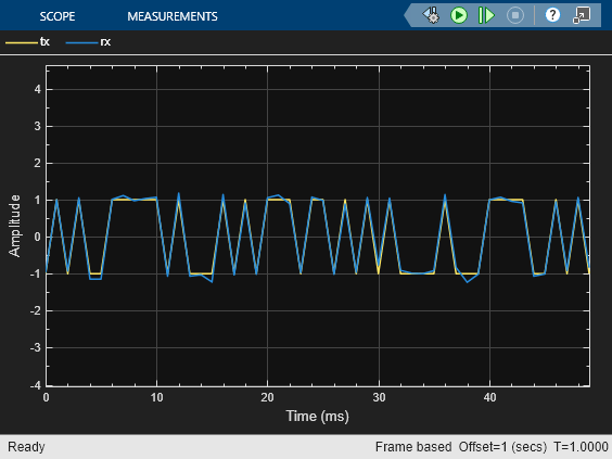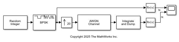 The cm_int_dump_filtering model upsamples BPSK modulated random binary data, adds noise to the data, and then applies integrate-and-dump filtering. A timescope plots the real component of samples for a frame of the transmitted random integer data (tx) and the received data after integrate and dump filtering (rx).