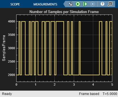 The cm_varsize_qpsk_ber.slx model generates frames of source data by using two Bernoulli Binary blocks. One Bernoulli Binary block outputs 2000 samples per frame and the other outputs 4000 samples per frame. The model uses a switch to randomly vary which Bernoulli Binary block supplies the frame of source data to transmit. The model plots the frame length variation and computes the BER for each input frame.