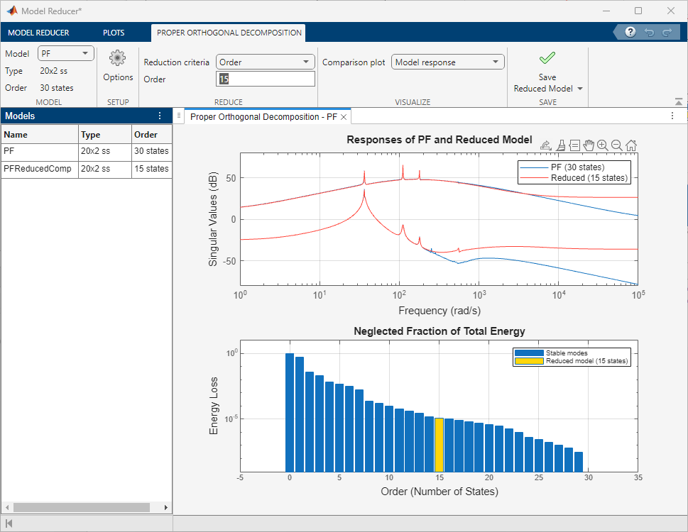 To save the reduced model in the app workspace, click Save Reduced Model. Click the saved model and rename it to PFReducedComp.