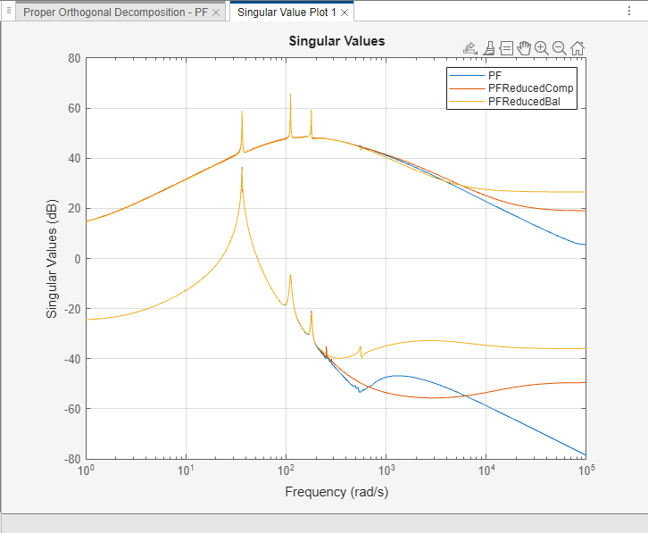 Save the model and rename it to PFReducedBal. You can compare the original model with the two reduced models. Click the Plots tab and select the Singular Value plot.