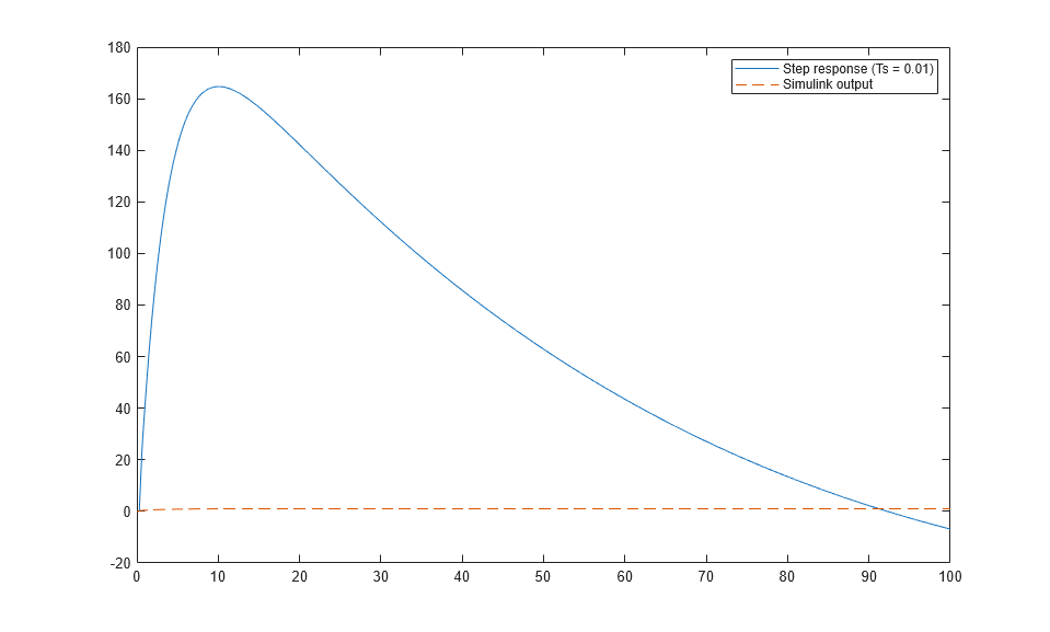 Compute the step response using a discrete time vector with Ts = 0.01. The response computed by step does not match the Simulink result. This mismatch indicates that the sample time is too large to capture the fast dynamics introduced by the internal delay.