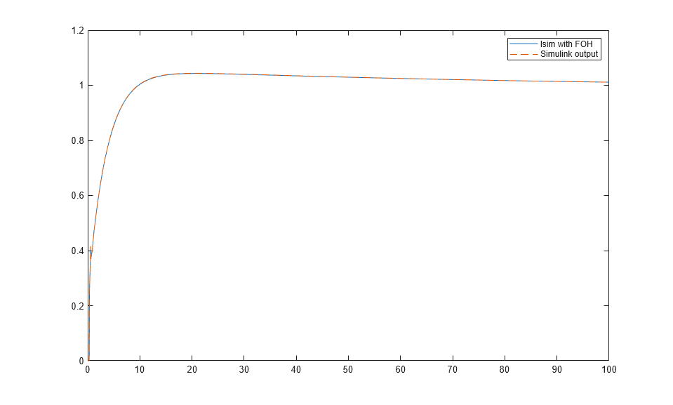 Compute the initial operating point and simulate the response using lsim with FOH. The result closely matches the Simulink output, confirming that FOH better represents the underlying continuous system.