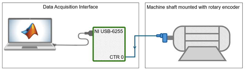 This example shows how to acquire angular position data using an incremental rotary encoder and a multifunction data acquisition (DAQ) device with the Data Acquisition Toolbox™ quadrature encoder measurement functionality.