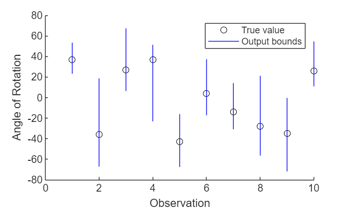 figure hold on for i = 1:10 plot(i,T(i),"ko") line([i i],[YLower(i) YUpper(i)],Color="b") end hold off xlim([0 10]) xlabel("Observation") ylabel("Angle of Rotation") legend(["True value","Output bounds"])