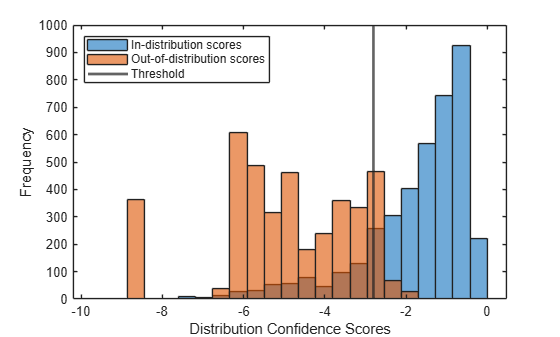 Use the networkDistributionDiscriminator function to create a distribution discriminator. A distribution discriminator assigns a confidence score to each input. ID data typically yields higher scores than OOD signals. The function then computes a threshold that optimally separates ID and OOD data based on their scores. In this example, the discriminator uses the HBOS method, which computes a score by binning the specified layer activations and summing their log-histogram probabilities. This method works well because OOD inputs tend to produce activation patterns that occur infrequently in the ID distribution. For more information about how to compute distribution confidence scores, see Distribution Confidence Scores.