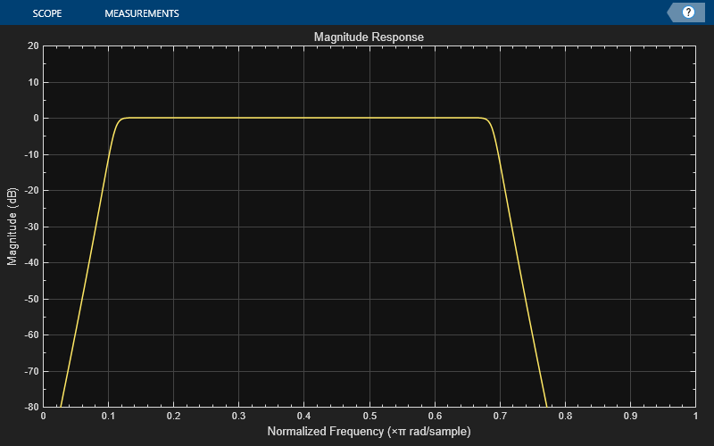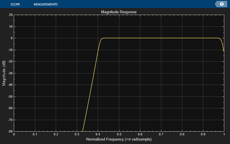filterViz = dsp.DynamicFilterVisualizer(NormalizedFrequency=true,YLimits=[-80 20]);