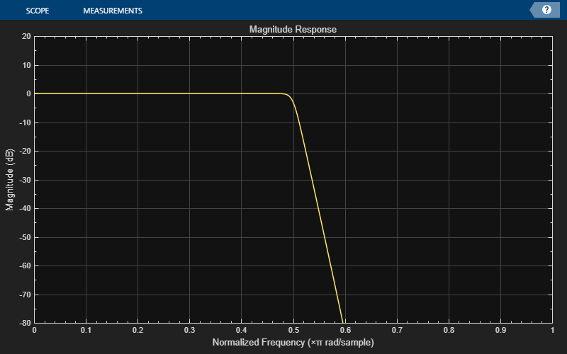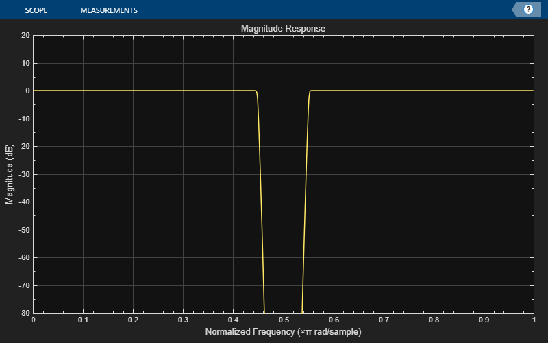 filterViz = dsp.DynamicFilterVisualizer(NormalizedFrequency=true,YLimits=[-80 20]); filterViz(psosFilt)