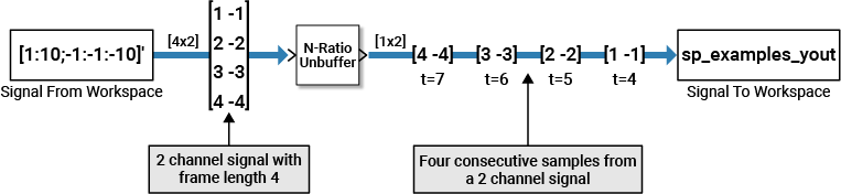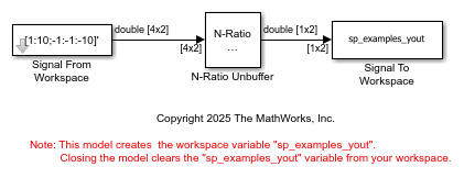 Use the N-Ratio Unbuffer block to unbuffer multichannel signals of frame length N into multichannel signals of frame length 1, where N is a positive integer greater than 1.