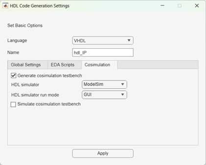 To generate a cosimulation testbench, in the Configure HDL options, on the Cosimulation tab, select Generate cosimulation testbench. Also, select your HDL simulator. This example uses ModelSim and opens the HDL simulator in GUI mode.