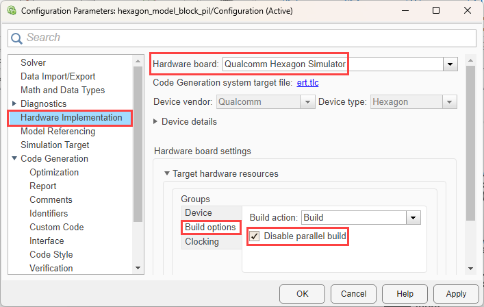 on– When you select this option, the support package compiles generated code in a sequential order.off– When you clear the option, the support package compiles generated code parallely. Parallel execution reduces the time taken to build the model.
