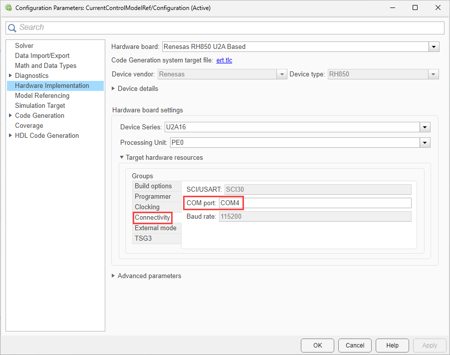 Renesas RH850 U2A Basedboard.Navigate to Target hardware resources > Connectivity and enter the COM Port number. To find the COM port number, check the Device Manager on your PC.