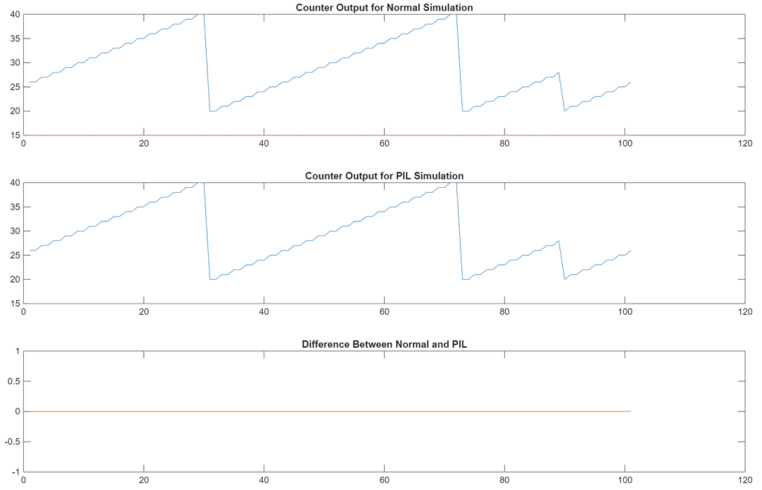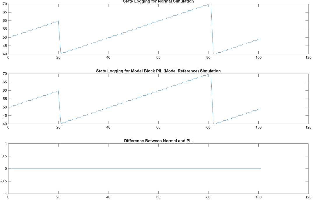PIL mode: yout2 = out2.logsOut; yout2_pil = yout2.get('counterOut').Values.Data; xout2 = out2.xout; xout2_pil = xout2{1}.Values.Data; Normal Mode: set_param([model '/Counter'],"SimulationMode","Normal"); out2 = sim(model,20); yout2 = out2.logsOut; yout2_normal = yout2.get('counterOut').Values.Data; xout2 = out2.xout; xout2_normal = xout2{1}.Values.Data; fig3 = figure; subplot(3,1,1), plot(yout2_normal), title('Counter Output for Normal Simulation') subplot(3,1,2), ... plot(yout2_pil), title('Counter Output for Model Block PIL (Model Reference) Simulation') subplot(3,1,3), plot(yout2_normal-yout2_pil), ... title('Difference Between Normal and PIL'); fig4 = figure; subplot(3,1,1), plot(xout2_pil), title('State Logging for Normal Simulation') subplot(3,1,2), ... plot(xout2_normal), title('State Logging for Model Block PIL (Model Reference) Simulation') subplot(3,1,3), plot(xout2_normal-xout2_pil), ... title('Difference Between Normal and PIL');