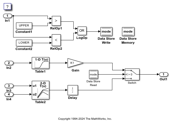 The model creates numeric variables in the base workspace. Blocks in the model use these variables to set parameter values (such as the Gain parameter of a Gain block). Some of the signals and block states in the model have explicit names, such as input1.