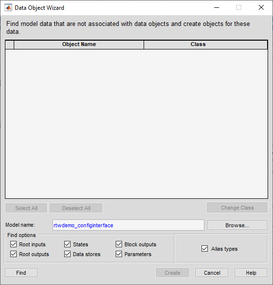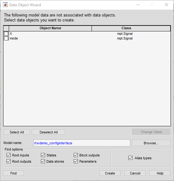 In the Data Object Wizard, click Find. The wizard proposes the creation of Simulink.Parameter objects to replace the variables and the creation of Simulink.Signal objects to represent the signals and states.
