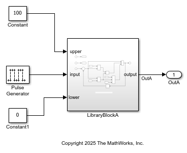 Open the libraryRef2 model. libraryRef2 contains two instances, LibraryBlockA and LibraryBlockB, of the same linked library block from the faultedCounterLibrary library. However, libraryRef2 is not synchronized, and the block in faultedCounterLibrary contains a fault. This fault in does not appear in the parent model in either the LibraryBlockA and LibraryBlockB instances.