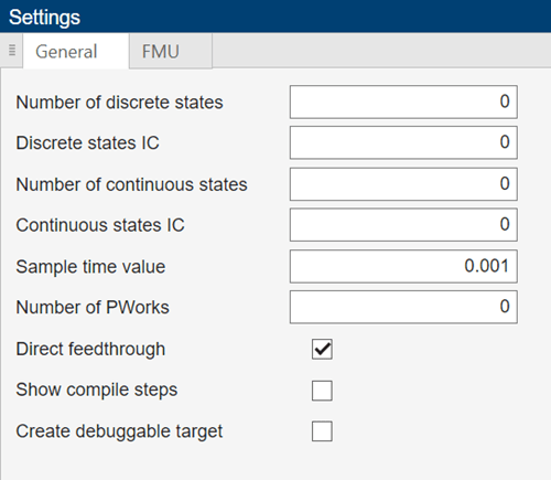 Specify General and FMU settings in the Settings pane.