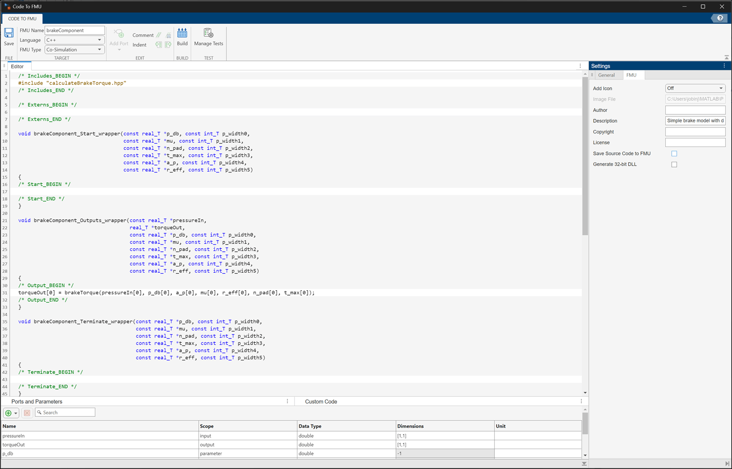 Define the required FMU algorithm that uses the imported C/C++ functions within the callbacks in the Code To FMU Editor pane. In this example, the brakeComponent_Outputs_wrapper callback is defined as: