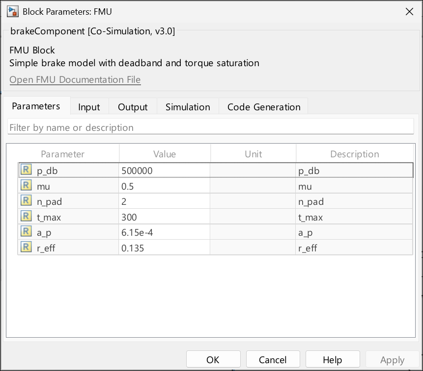 Double-click on the FMU block to open the block dialog box. Specify the values of the FMU parameters.