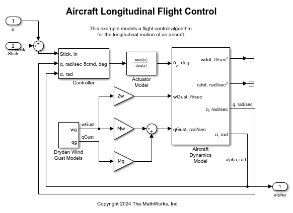 fmuexport_aircraft_flight_control_plant models flight control for the longitudinal motion of an aircraft. First order linear approximations of the aircraft and actuator behavior are connected to an analog flight control design that uses the pilot's stick pitch command as the set point for the aircraft's pitch attitude and uses aircraft pitch angle along with pitch rate to determine commands. A simplified Dryden wind gust model is incorporated to perturb the system.