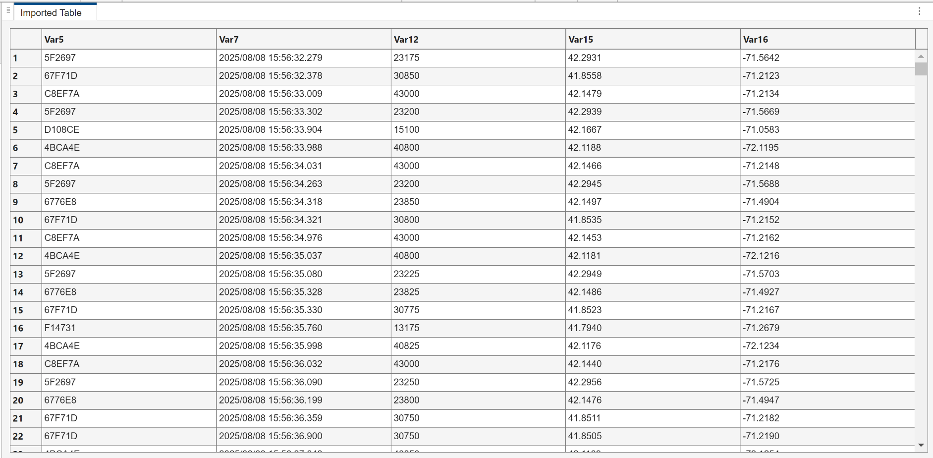 "MSG"     3       1       1      "67F71D"     1      "2025/08/08"    15:56:32.378    "2025/08/08"    15:56:32.401    <missing>    30850     NaN      NaN     41.856    -71.212      NaN     NaN        0      NaN        0        0