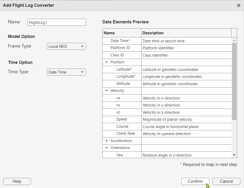 To identify information in the table, you create a converter that contains a list of data elements expected by the app and then map the imported table columns to these data elements. First, click the New Converter button in the toolstrip and select Flight Log. Click on the Confirm button in the opened dialog, which creates a new flight log converter.