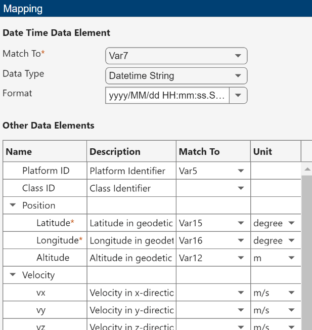 After that, the app opens a mapping panel that allows you to map between columns in the imported table with state elements contained in the flight log. Map Var7, Var5, Var15, Var16, Var12 to the elements of Data Time, Platform ID, Latitude, Longitude, and Altitude, respectively. Additionally, select the corresponding formats and units for these variables as shown below.
