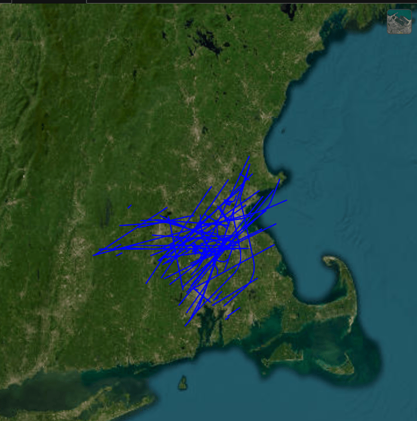 Click the Visualize button in the toolstrip to display the trajectories of aircraft on a globe. The display shows flight trajectories near the Boston area. You can further explore the data, such as platform waypoints and trajectories, by using context menus of the converted table. For more details, see the Import Flight Log Data Using Tracking Data Importer App example.