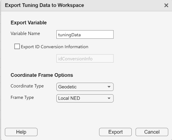 Click the Export button from the toolstrip and select the Tuning Data option. The export dialog opens and you can click the Export button to export the tuningData variable to workspace.