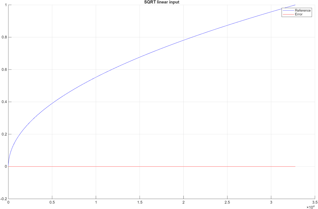 comparison_plot_sqrtLUT(ref_SQRT,implementation_SQRT,1,"SQRT linear input");Maximum Error SQRT linear input 7.906744e-06 Maximum PctError SQRT linear input 1.358995e-03