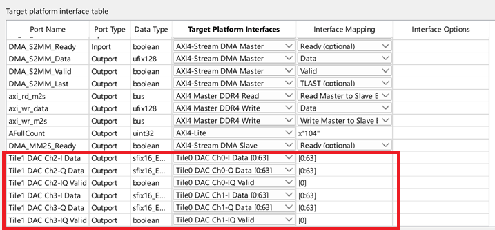 In step 1.3, if you are using a ZCU208 board, for the DAC ports, set the target interface as shown in the image.