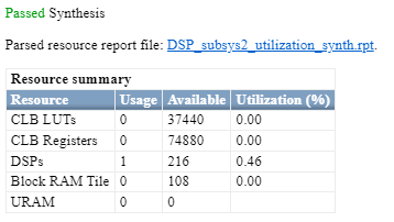 The DSP_subsys2 implements the same operation by using bit widths that match the DSP on a Xilinx UltraScale FPGA. If you deploy this subsystem onto a Xilinx Artix UltraScale® FPGA, you will see that the entire design fits onto a single DSP slice.