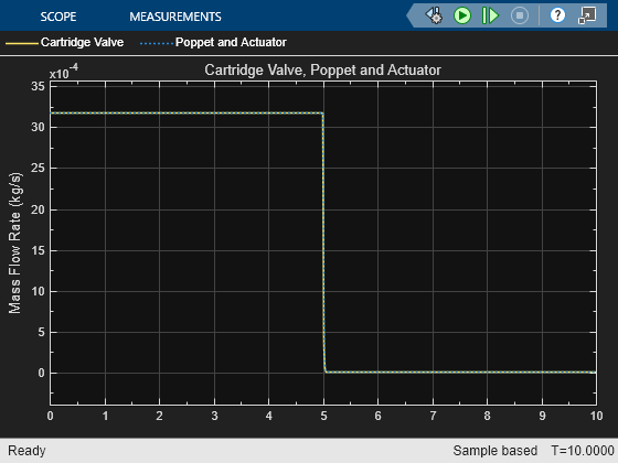 This figure shows the mass flow rate through the Cartridge Valve Insert (IL) block and the equivalent Poppet Valve (IL) block and Cartridge Valve Actuator (IL) block composite system. When the time is 5 s, the signal at port X increases by 2*10^6 Pa. This pressure increase triggers the valve to close and the flow rate to drop.