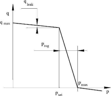 The pump tries to maintain preset pressure at its outlet by adjusting its delivery flow in accordance with the system requirements. If pressure differential across the pump is less than the setting pressure, the pump outputs its maximum delivery corrected for internal leakage. After the pressure setting has been reached, the output flow is regulated to maintain preset pressure by changing the pump's displacement. The displacement can be changed from its maximum value down to zero, depending upon system flow requirements. The pressure range between the preset pressure and the maximum pressure, at which the displacement is zero, is referred to as regulation range. The smaller the range, the higher the accuracy at which preset pressure is maintained. The range size also affects the pump stability, and decreasing the range generally causes stability to decrease.