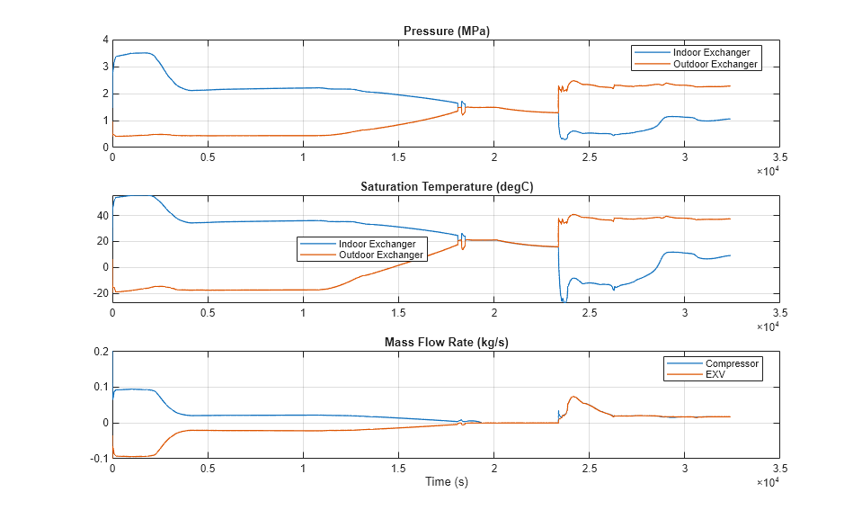 This plot shows the high and low pressures in the refrigeration cycle and the corresponding saturation temperatures. During heat pump mode, the directional valve directs refrigerant to the indoor heat exchanger first, so the electronic expansion valve flow rate and the compressor flow rate have opposite signs. During air conditioning mode, the direction valve switches the flow direction so that the electronic expansion valve flow rate and the compressor flow rate have the same sign.