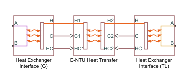 In most scenarios, you do not need to use the fundamental component blocks. You can use them to model a heat exchanger with fluid flowing in multiple different paths. Specific dissipation, gas and thermal liquid E-NTU, and half heat exchanger blocks are composite components built from the blocks in the Fundamental Components block library. To see the components that make up each block, read the reference page for that block. For example, the Heat Exchanger (G-TL) comprises three fundamental component blocks. A Heat Exchanger Interface (G) block models the gas flow, a Heat Exchanger Interface (TL) block models the thermal liquid flow, and an E-NTU Heat Transfer block models the heat exchanged across the wall between the flows.