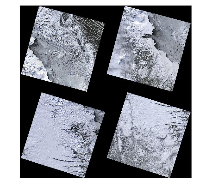 This example uses four Landsat 9 multispectral tile images that cover a contiguous area of the eastern part of Quebec, Canada, near the western shore of the Labrador Sea. The tiles are approximately temporally consistent, but not radiometrically or atmospherically corrected. You can apply preprocessing such as cloud masking or surface normalization, if required for your application.