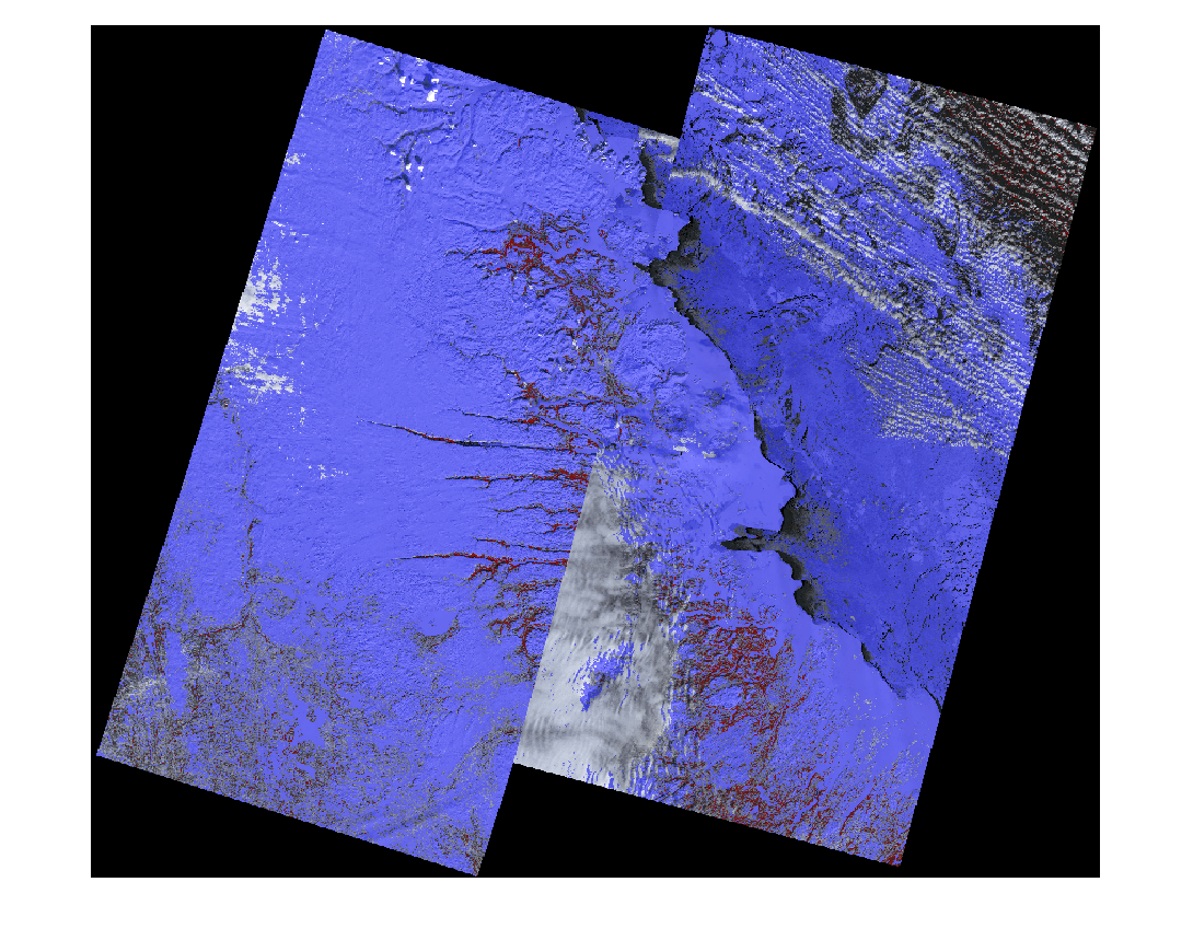 overlayImg = labeloverlay(colorImg,maskGVI,Colormap=[1 0 0],Transparency=0.5); overlayImg = labeloverlay(overlayImg,maskNDSI,Colormap=[0 0 1],Transparency=0.5); dispOverlayImg = imresize(overlayImg,0.35); figure imshow(dispOverlayImg)