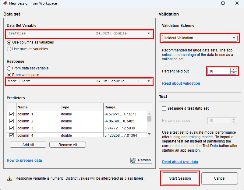 The app trains a model on the training set and assesses its performance with the validation set. The model used for validation is based on only a portion of the data, so Holdout Validation is recommended only for large data sets. The final model is trained with the full data set. In this example, Percent held out is set to 30. This value indicates that 70% of the data is used for training the machine learning algorithm.