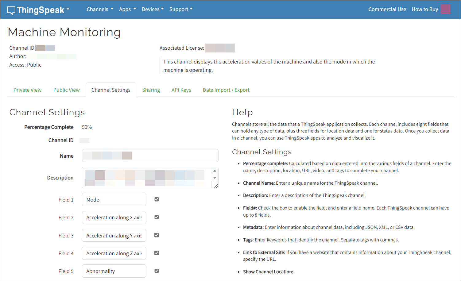 To monitor the device using ThingSpeak™, sign in using your MathWorks® Account credentials, or create a new account. Create a new channel in ThingSpeak to collect and analyze the data from the device. To create a new channel in ThingSpeak, on the Channels tab, click My Channels. In the My Channels window, click New Channel and enter these values to customize the channel.