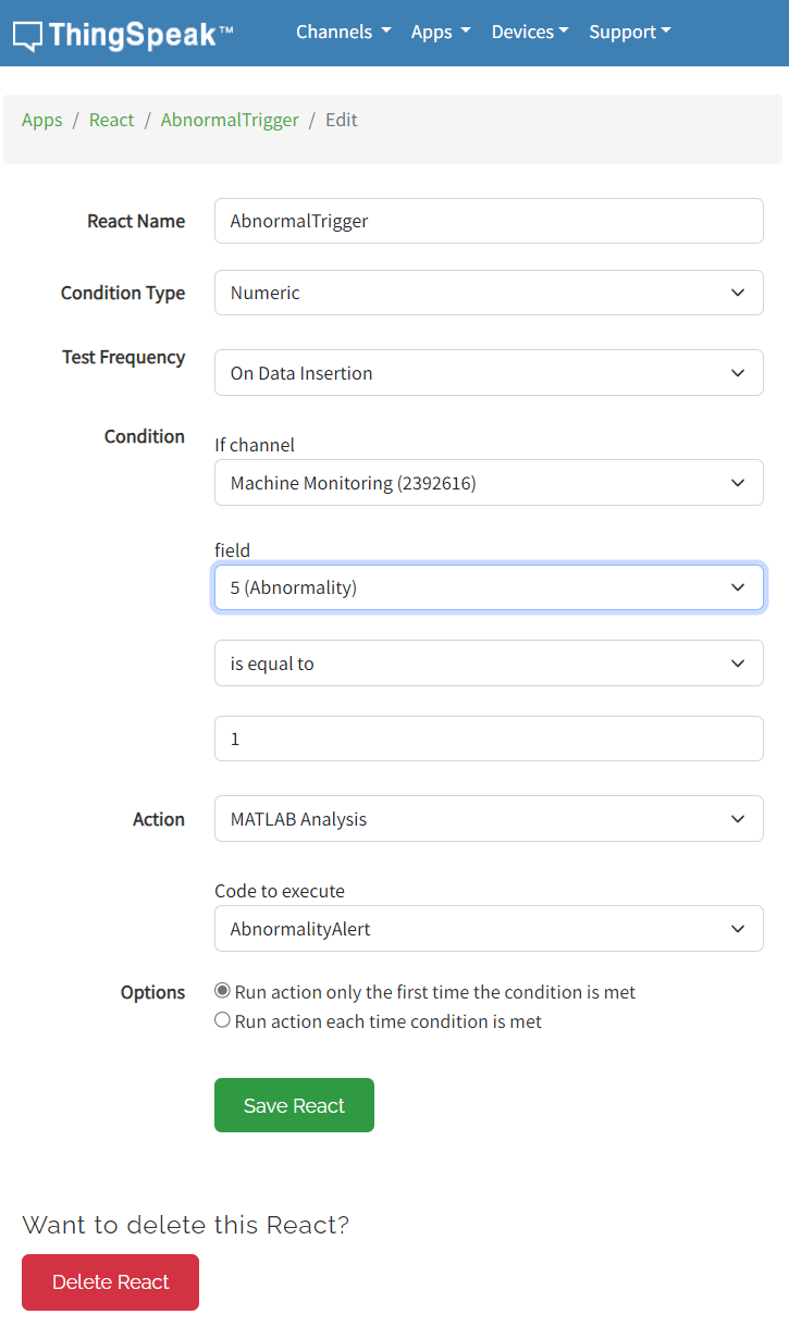To set up an email alert for when any abnormality is detected, on the Apps tab in ThingSpeak, click Actions, and then click React. In the React window, set these parameters.