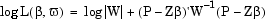 where P is the vector formed by stacking the n vectors pi on top of each other, Z is the matrix formed by stacking the n Xi matrices, W is the block diagonal weighting matrix with the matrices on the diagonal being σ2Ci+D, and ω is a vector of dispersion parameters. For the multivariate normal distribution (6-14) the negative log likelihood function can be written: