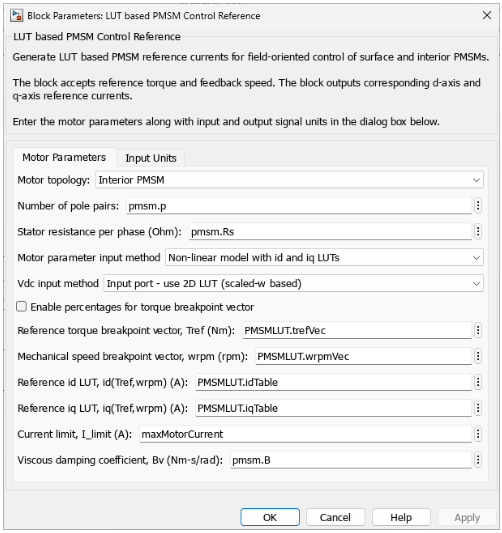 For either model, in the Motor Parameters tab of LUT based PMSM Control