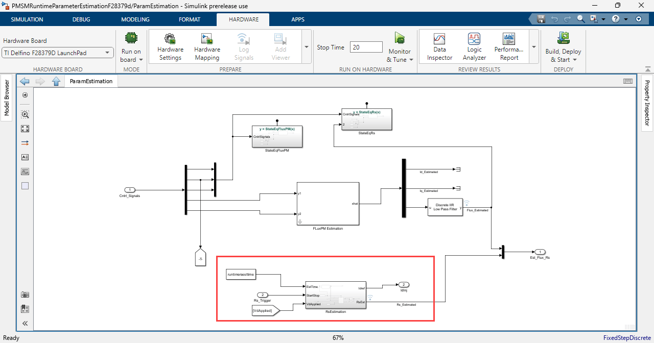 The example includes the target model PMSMRuntimeParameterEstimationF28379d.
