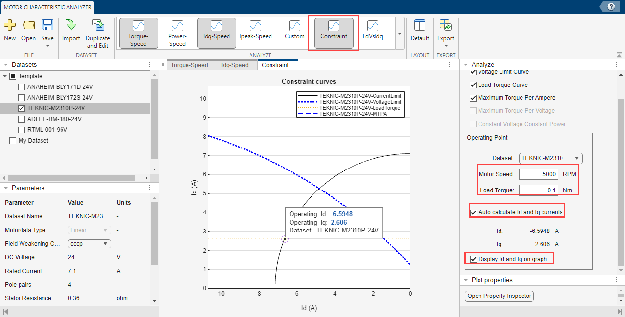 5. Select Display Id and Iq on graph option. The Constraint curves graph gets updated to show the exact operating point.